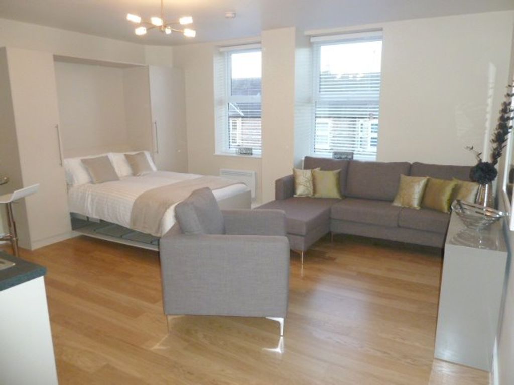 IMMACULATE BUILT LUXURY STUDIO APARTMENT IN the centre of ALTRINCHAM TOWN CENTRE a couple of minutes walk to the faboulous Altrincham Markets, METROLINK and Train Station, and all of Altrinchams many shops, restaurants and bars. Built to an exceptional high standard throughout, the apartment has one allocated parking space and benefits from a Video Door Entry System with both lift and stair access. Entrance Hallway, Open Plan contemporary kitchen / lounge / living / and bedroom area with a modern fitted double bed that can be down or pushed up to give a smooth wall finish if you wish to have the area as one large reception room during the day or with visitors.MODERN FITTED WHITE GLOSS KITCHEN with integrated appliances including dishwasher, built in microwave, electric oven and hob. Washer in separate utility cupboard. A contemporary large bathroom with shower over bath.The property is warmed by Electric Heating and is Double Glazed throughout. Restrictions; No smokers, No pets. FULLY FURNISHED. AVAILABLE FOR 6 MONTH LET. 23/12/2025.