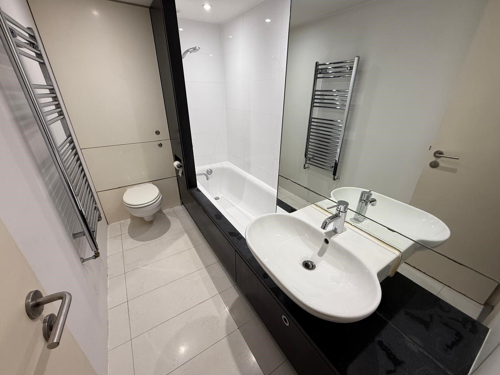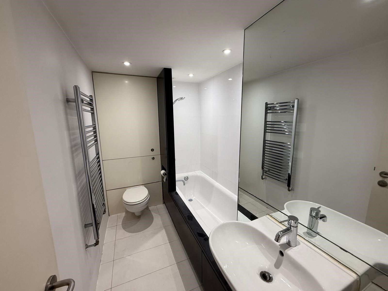 The bathroom comprises of a bath, overhead shower, hand basin and wc. A wall mounted heated towel rail, storage cupboards behind the WC and under the sink. The flooring is tiled and the ceiling has a range of spotlights.
