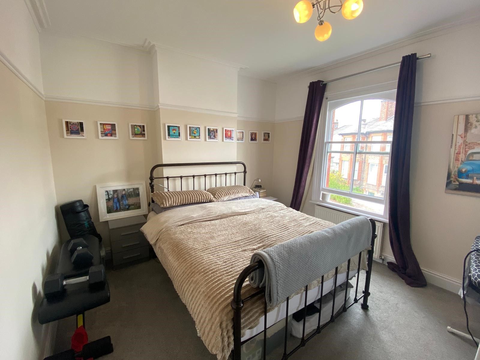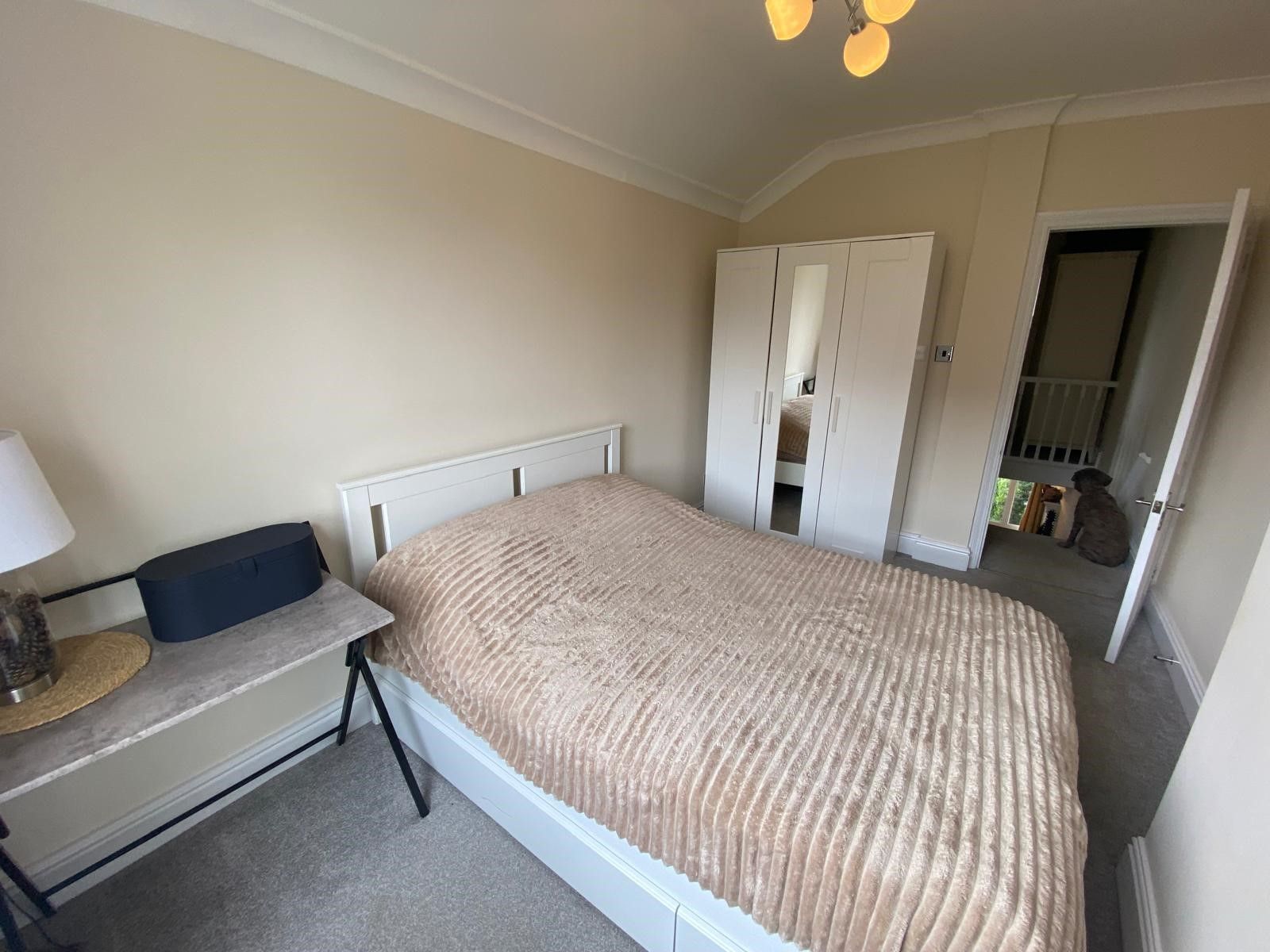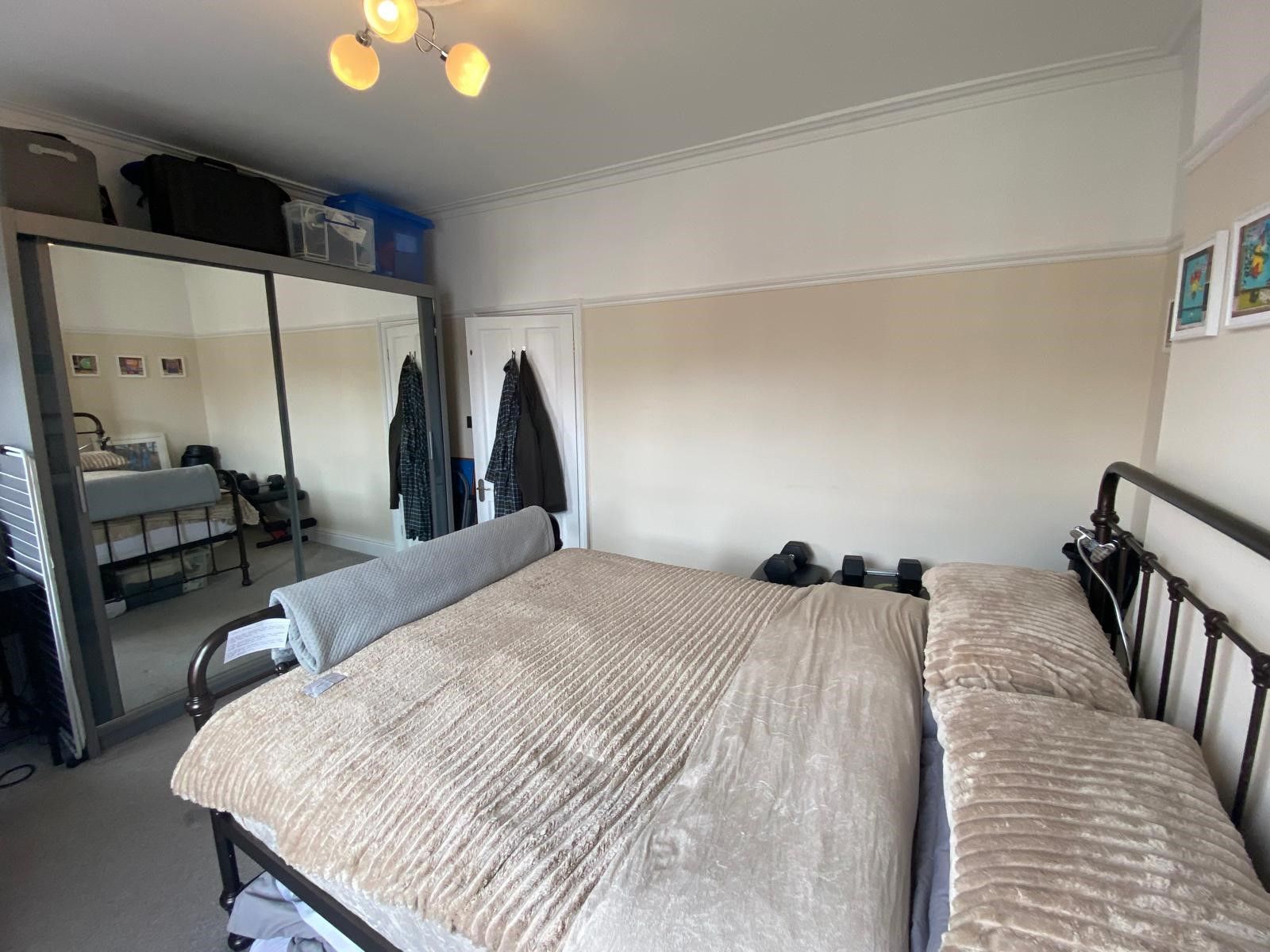 The master bedroom is a bright and airy sanctuary, enhanced by dual period sash windows that flood the space with an abundance of natural light. A decorative ceiling rose serves as a charming focal point, complemented by an elegant central light fitting. The room is tastefully decorated throughout and finished with plush, soft carpeting underfoot, creating a warm and inviting atmosphere.