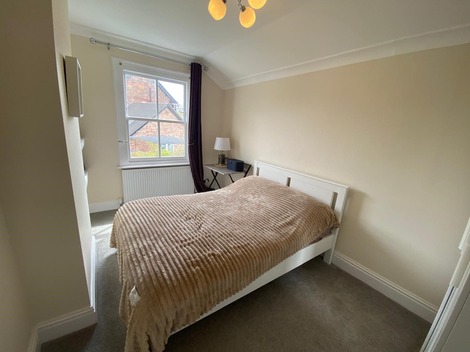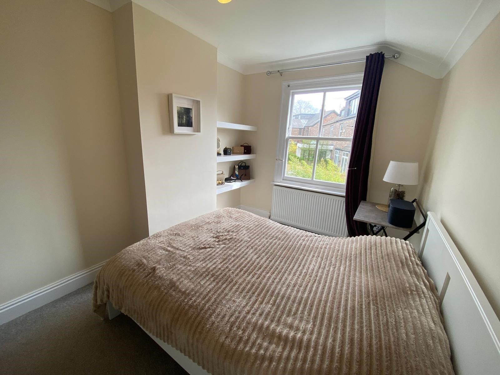 A beautifully appointed double bedroom, thoughtfully styled to blend comfort and character. Elegant wall-mounted shelving offers both practicality and charm, while a classic period sash window bathes the space in natural light. The room is finished with soft, plush carpeting underfoot and features a central ceiling light fitting, completing its inviting and refined ambiance.