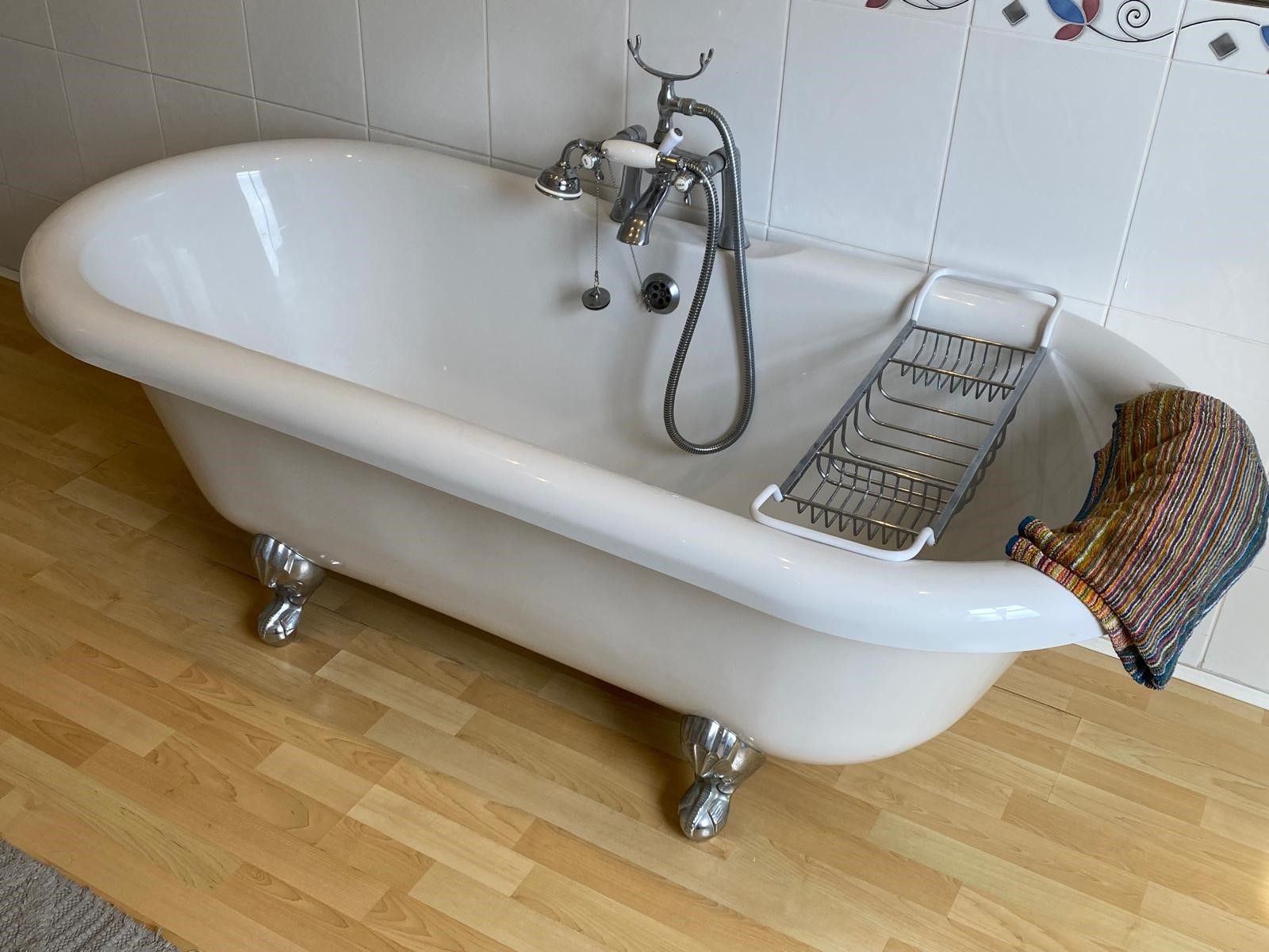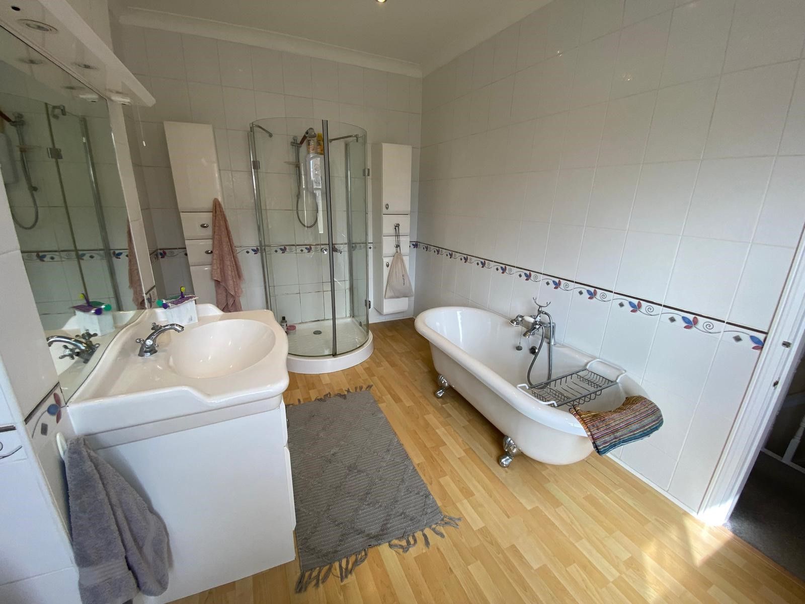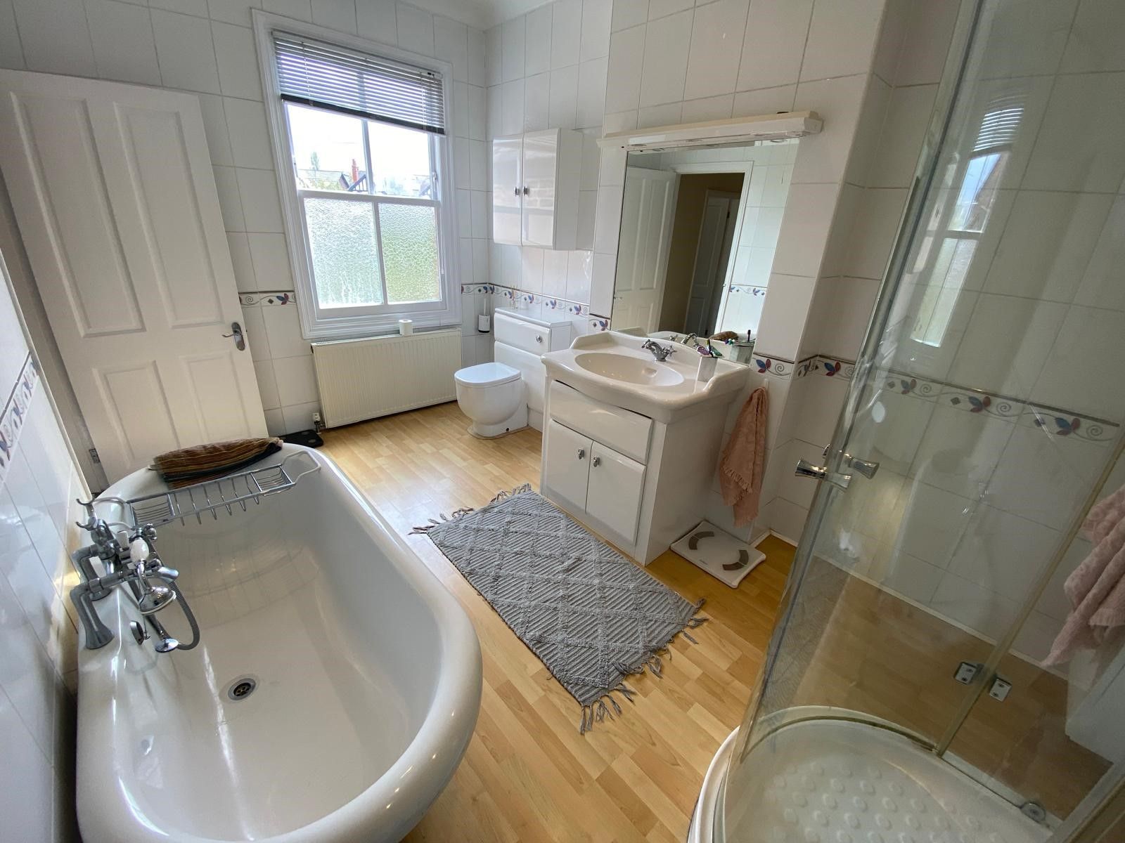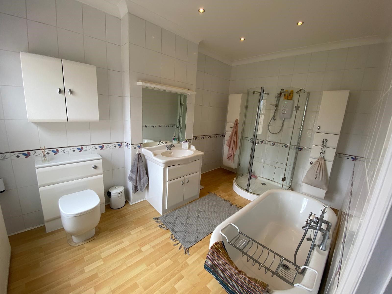 This exceptionally spacious bathroom not only exudes luxury but also offers the potential to be reconfigured to create an additional bedroom, if desired. The room showcases a stunning period roll-top bath, complete with elegant claw feet, a generously sized separate shower cubicle, and a stylish vanity unit with an integrated hand basin and WC. Elegantly fully tiled from floor to ceiling, the walls perfectly compliment the warm tones of the wooden flooring. Recessed spotlights enhance the room?s sophisticated ambiance, while a frosted double-glazed sash window allows for both privacy and natural light. Ample storage is provided by a range of thoughtfully designed cabinets, ensuring both practicality and style.