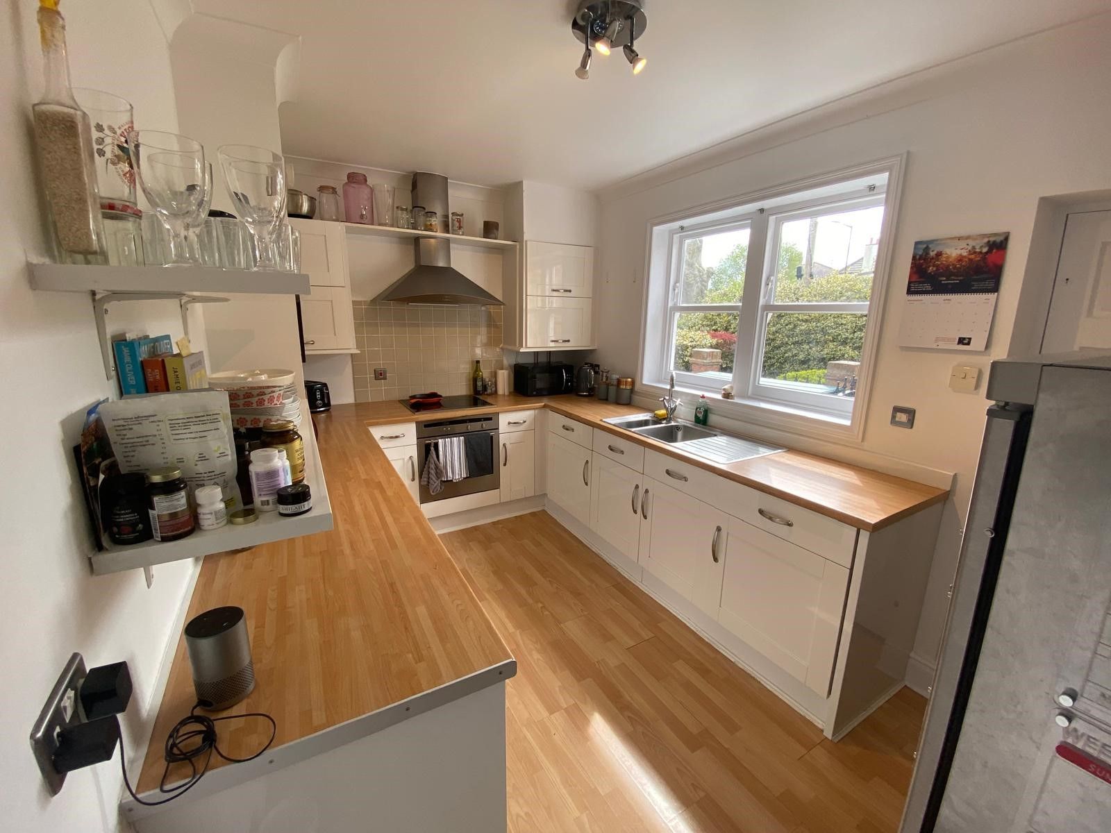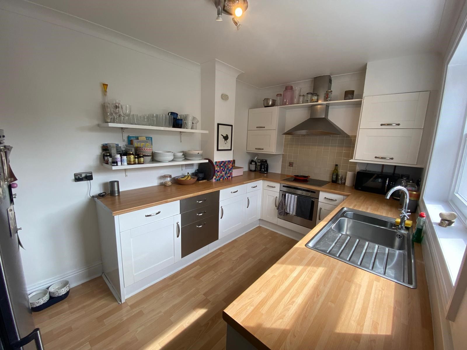 A fully fitted kitchen, thoughtfully designed for modern living. This impressive space includes a practical pantry room, complete with shelving for storage and housing the property's alarm system. The kitchen is beautifully appointed with an integrated electric oven, hob, and dishwasher, along with washing machine. A stylish range of wall and base units is complemented by a stainless steel extractor fan positioned above the cooker, and a tastefully part-tiled splashback adds both function and flair. The combi gas boiler which was installed 6 years ago is fitted behind the wall units. Natural light pours in through a generously sized sash window, offering views over the gardens, while a rear door provides convenient access to the Welsh slate paved patio area.