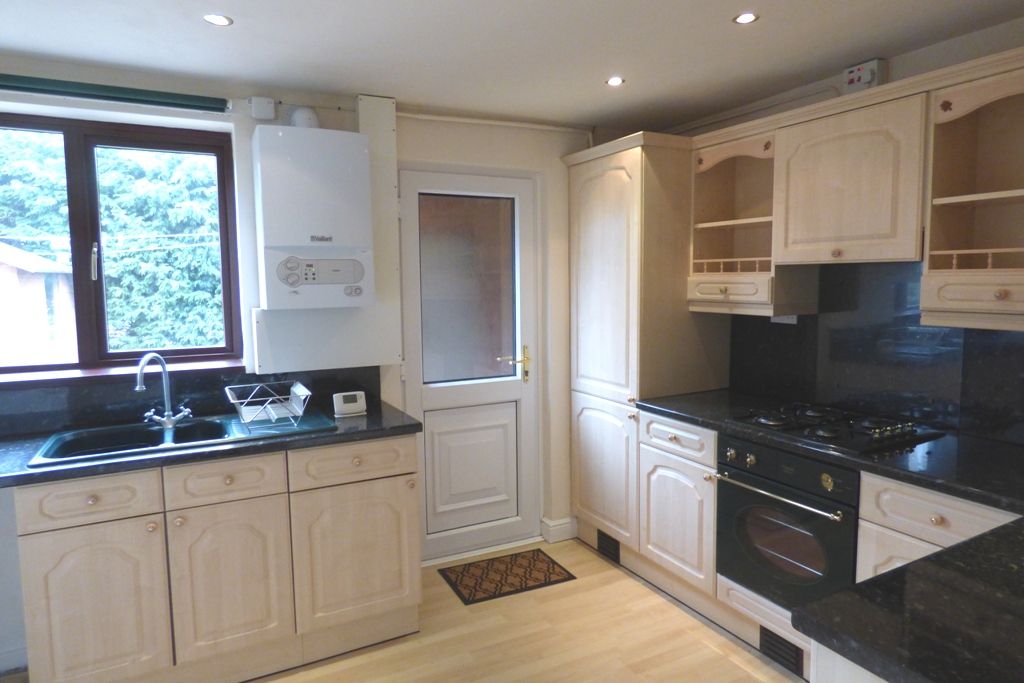 Wood effect units, built in gas hob, oven, extractor above, fridge freezer, recess for washing machine, one and half single drainer sink unit in green with mixer taps, wall mounted gas fired central heating boiler, ceiling light, laminated flooring, double glazed window and door to rear.