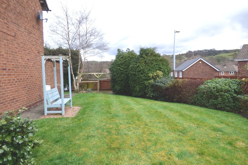 The garden wraps around three sides of the property. To the front is a small garden area with hedging and parking for two vehicles. Gated access leads to the side, providing additional hardstanding for parking and a large lawned area enclosed by hedging and shrubs. This continues to the rear, where there is a wooden pergola, two timber sheds, a brick outhouse and a paved patio area.