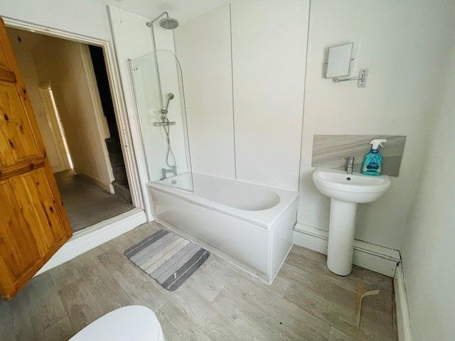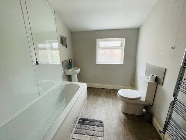 Rear-facing double-glazed window. White bathroom suite comprising a panelled bath with shower over, shower area with waterproof wall panels (in place of tiling), shower screen, pedestal wash hand basin, low-level WC, stainless steel heated towel rail, laminate flooring, wall-mounted shaving mirror, ceiling light, and extractor fan.