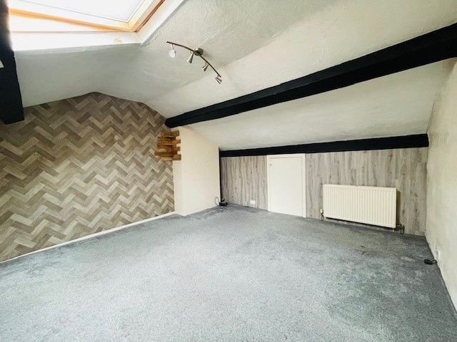 Potential to convert into a third double bedroom or master suite, subject to obtaining any necessary building, fire, and planning approvals. Features include a double panel radiator, central ceiling spotlight, three double power sockets, Velux window, under-eaves storage, exposed beams, and carpeted flooring.