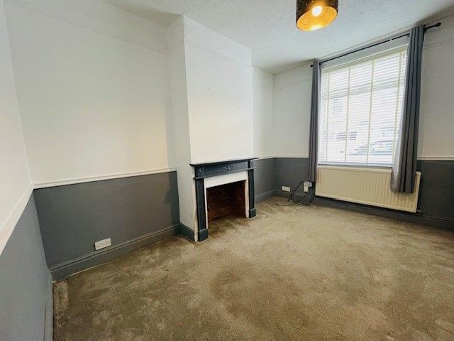 Internal wooden door with a brass handle, double-glazed window to the front, central ceiling light, telephone point, and a double panel radiator. Carpeted flooring, cupboard housing the electric meter and fuse box, feature brick fireplace, picture and dado rails, one double and one triple power socket.