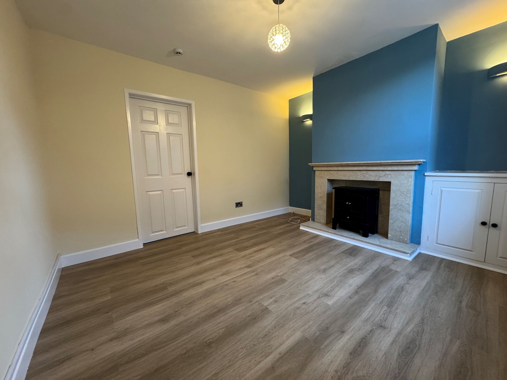 UPVC door with glass panel, double glazed window to the front elevation, laminate flooring, marble effect fireplace, central light fitting, two wall lights, radiator, power points.