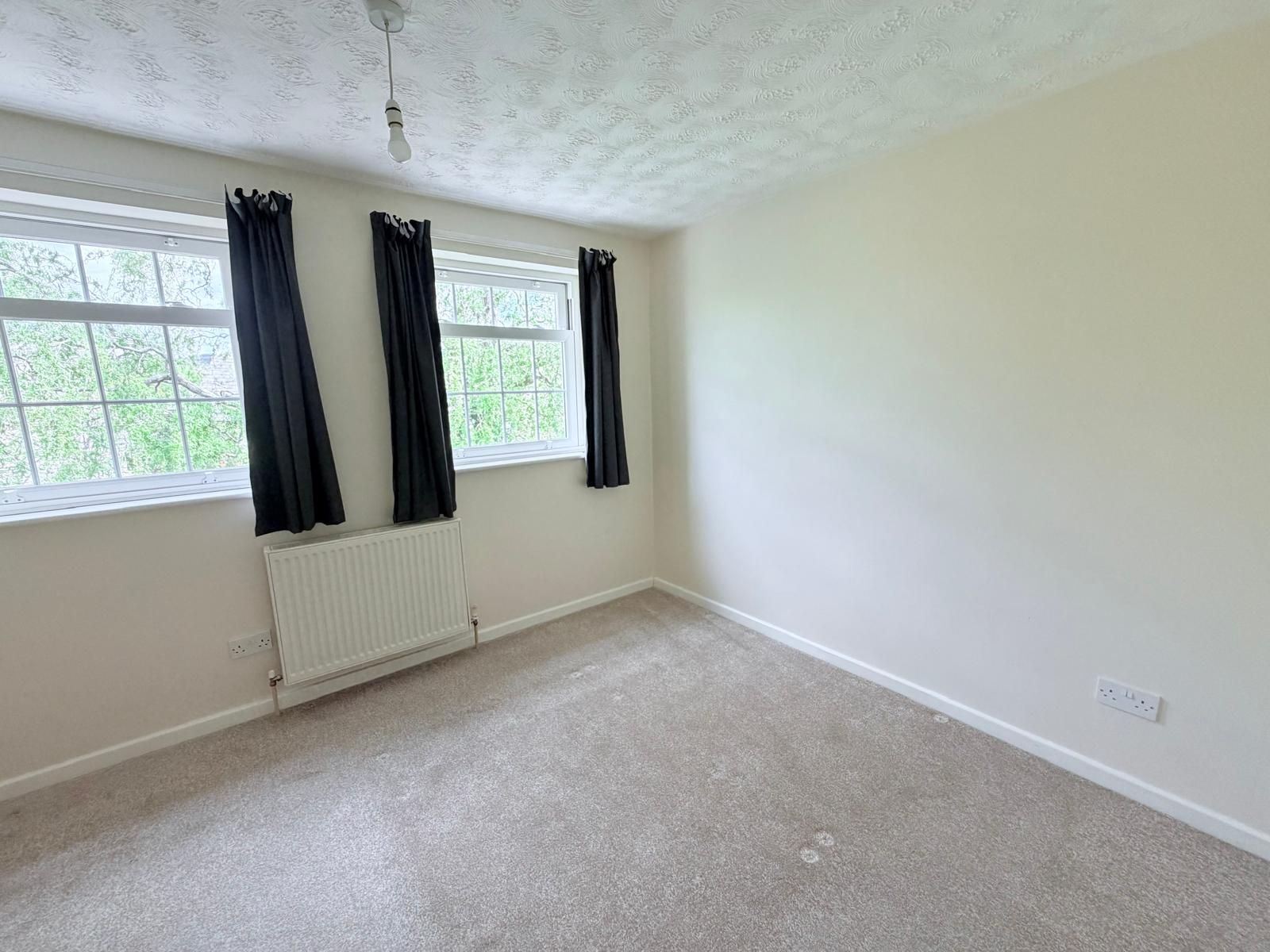 Bedroom 2 ? A well-proportioned room with carpeted flooring, a central ceiling light, and two UPVC sash windows fitted with rails and curtains. Features a radiator, one double and one single power point, and a built-in wardrobe with hanging space and shelving.