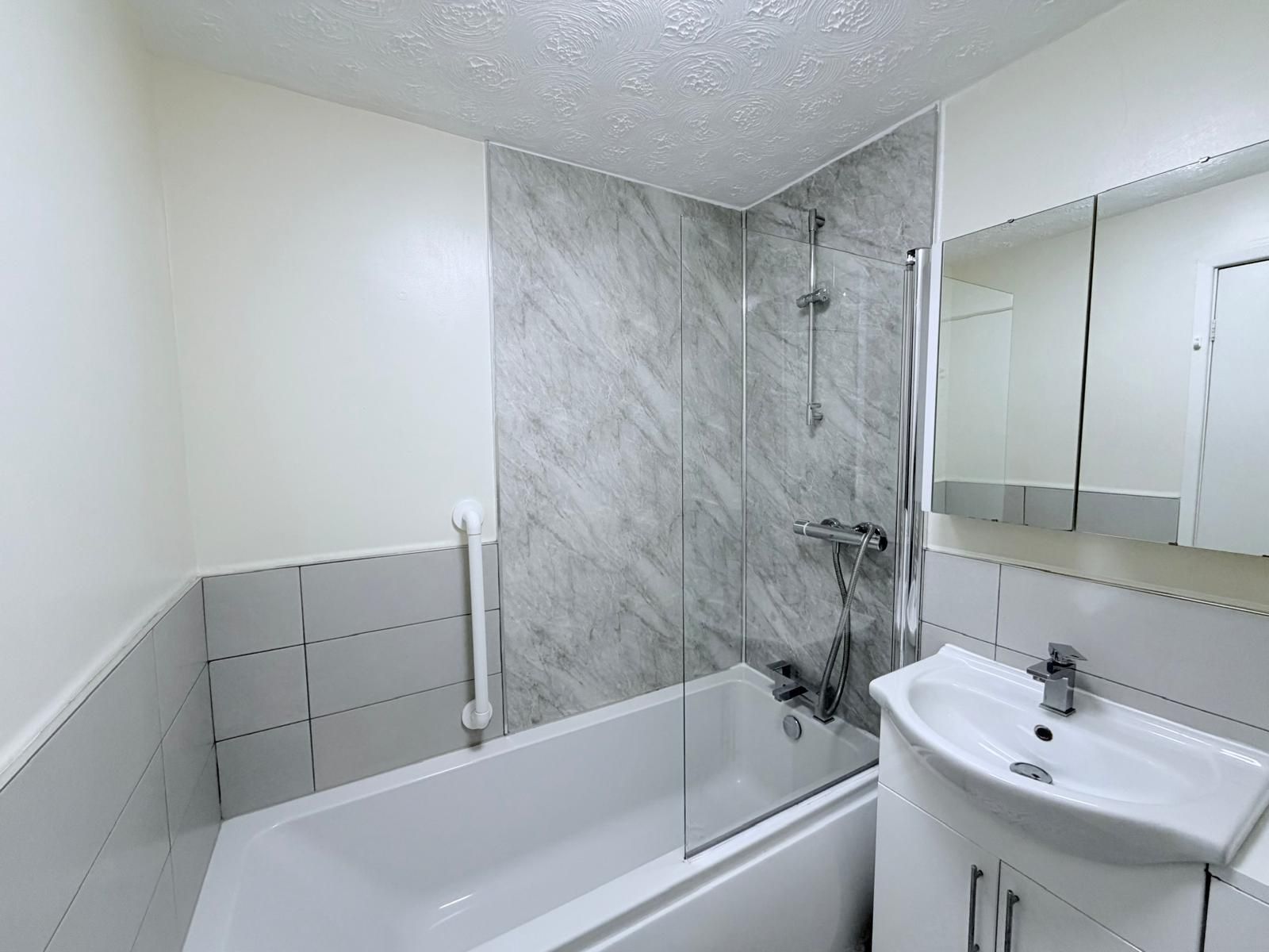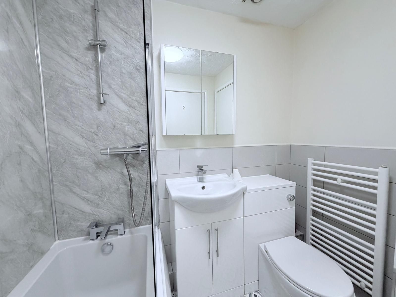 Bathroom ? central ceiling light, vinyl flooring, partially tiled walls, extractor fan, and heated towel rail. Fitted with a suite including a WC, pedestal wash basin, and a panelled bath with shower above, plus a built-in cupboard.