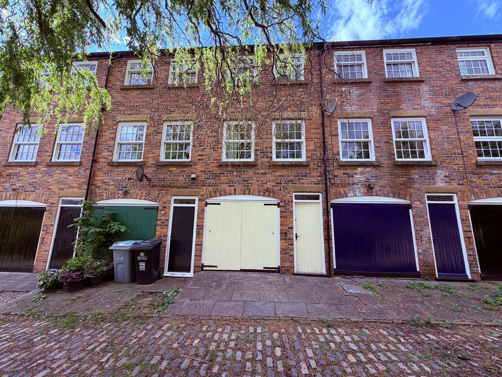 To the front, the property is set back from the pavement behind a walled, paved area with wrought-iron railings and a gate, an ideal sunny spot for a bench and morning coffee, or for bin storage. To the rear, a cobbled shared driveway provides access to the integral garage.