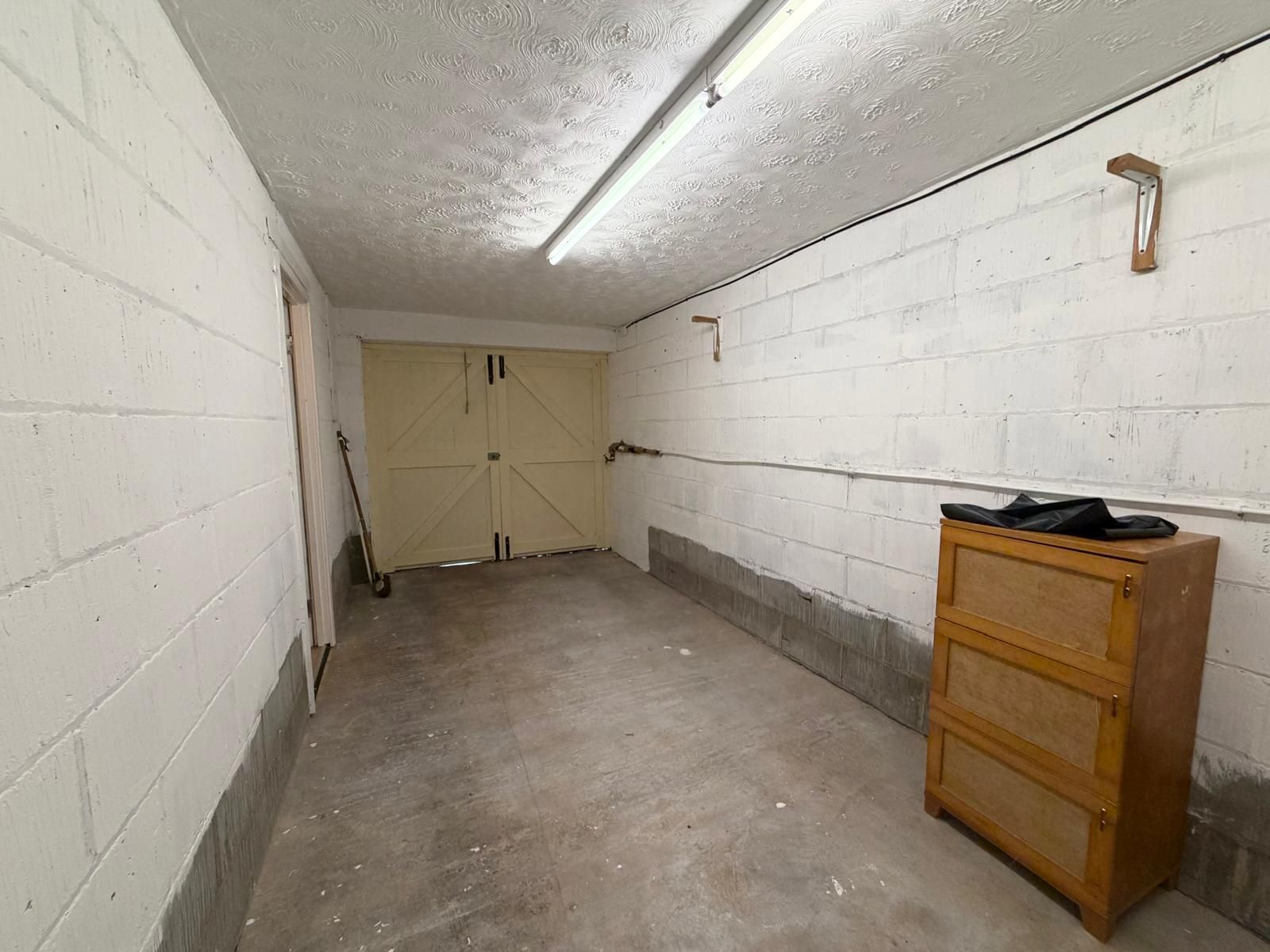 Single garage ? accessed internally from the lower ground floor hallway, with double wooden doors opening onto the cobbled driveway. The garage is equipped with power and lighting, a water tap, and plumbing for a washing machine. It also houses the electric meter, offers under-stairs storage, and provides access to a larger storage area with limited headroom.