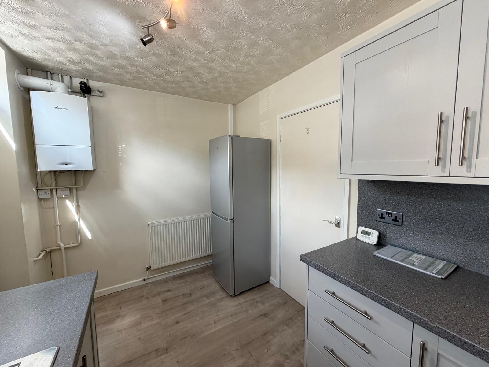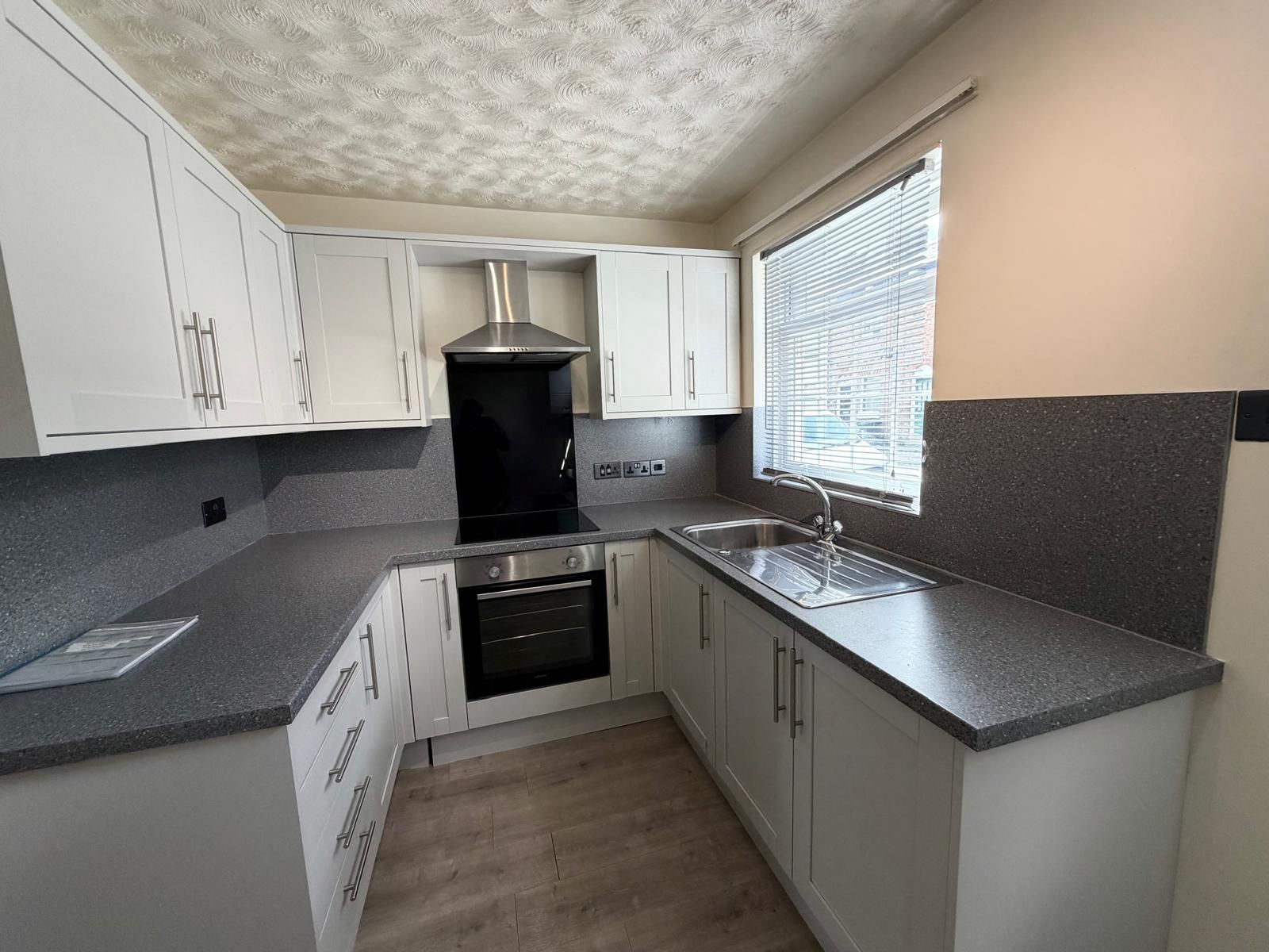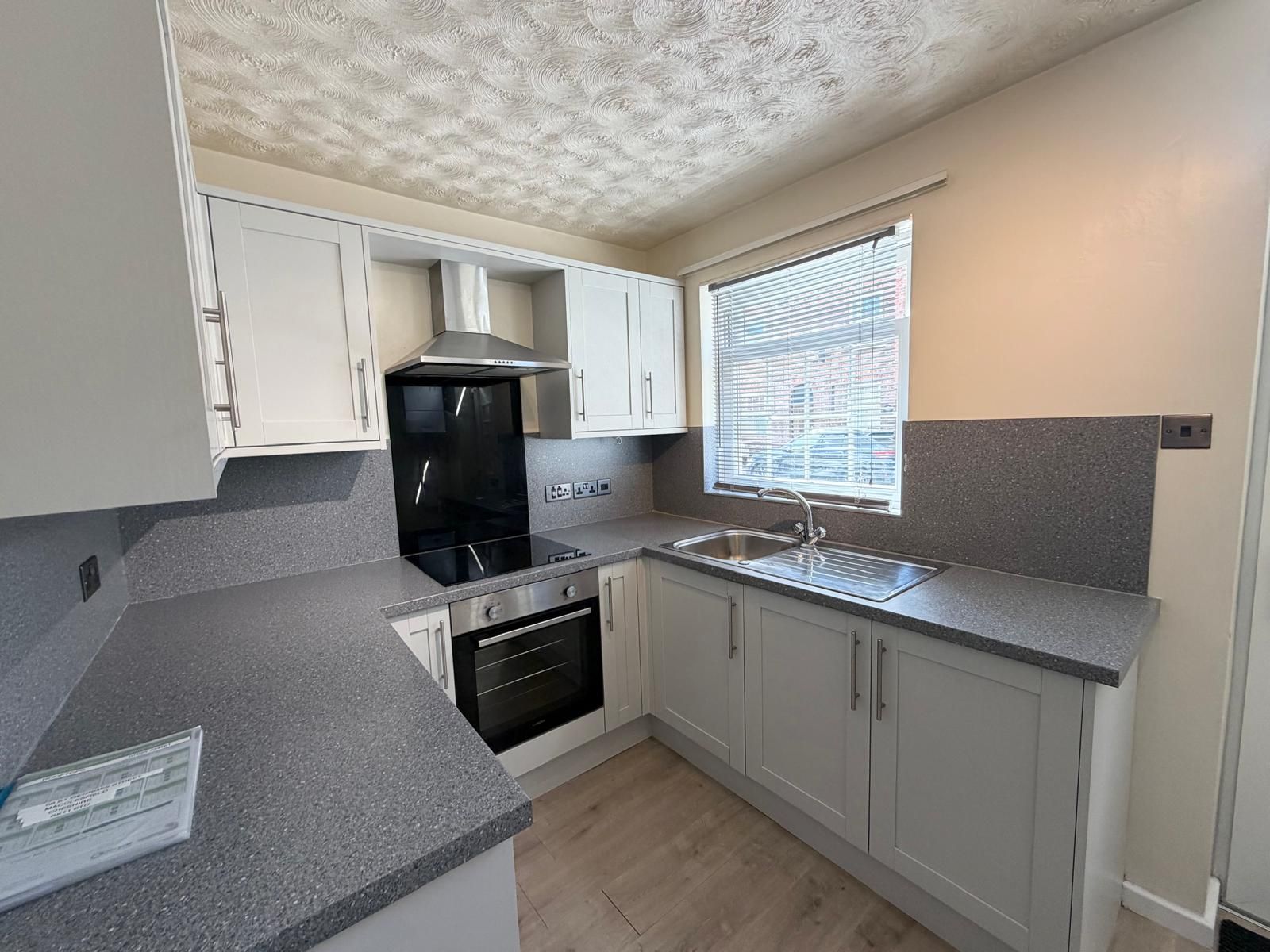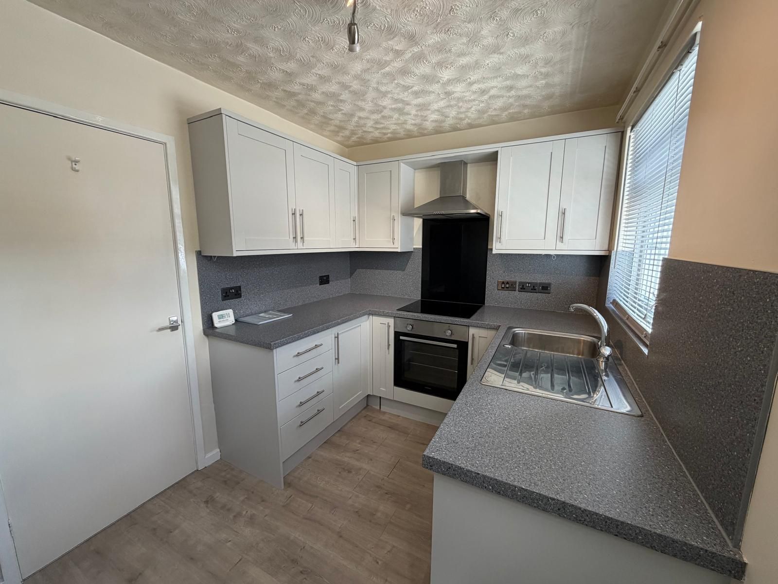 Kitchen (11'6" x 7'4") ? A bright, well-presented kitchen accessed via a UPVC front door, featuring modern grey units with matching worktops and tiled splashbacks. Includes a built-in electric hob with oven below and extractor hood above, plus a stainless steel sink unit. There are three double power points and one single. The room also houses a wall-mounted Worcester gas boiler, laminate flooring, a radiator, a freestanding fridge freezer, and space for additional appliances. Finished with a UPVC sash window to the front elevation.