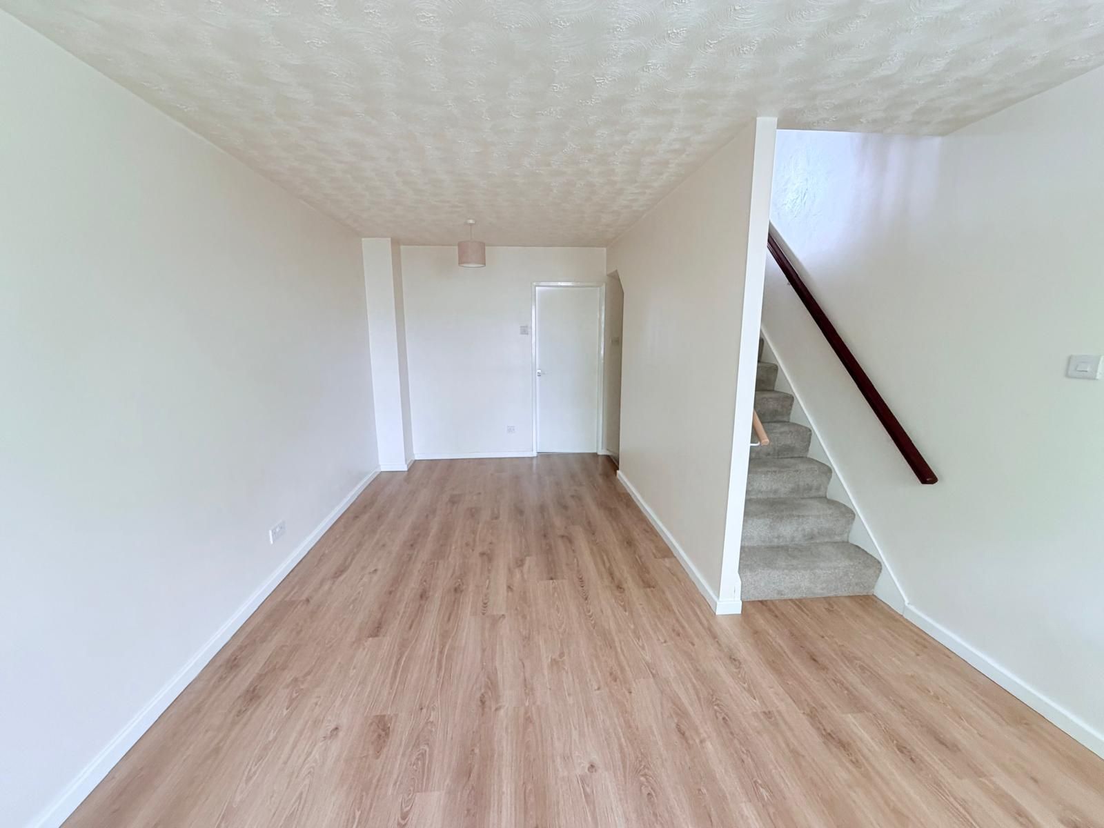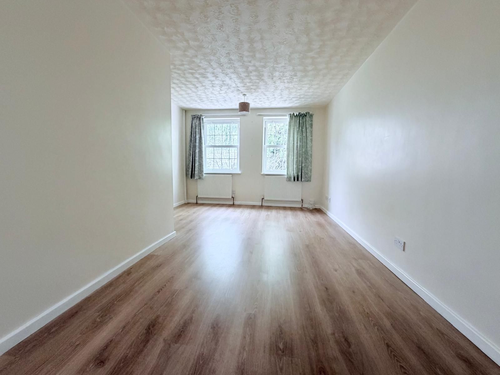Living Room ? An L-shaped, light and spacious living area featuring laminate flooring, two radiators, and two ceiling lights. Includes a TV point, two double power points, and two single power points. The room benefits from two UPVC sash windows with rails and curtains, along with stairs providing access to both the first floor and the lower ground floor.