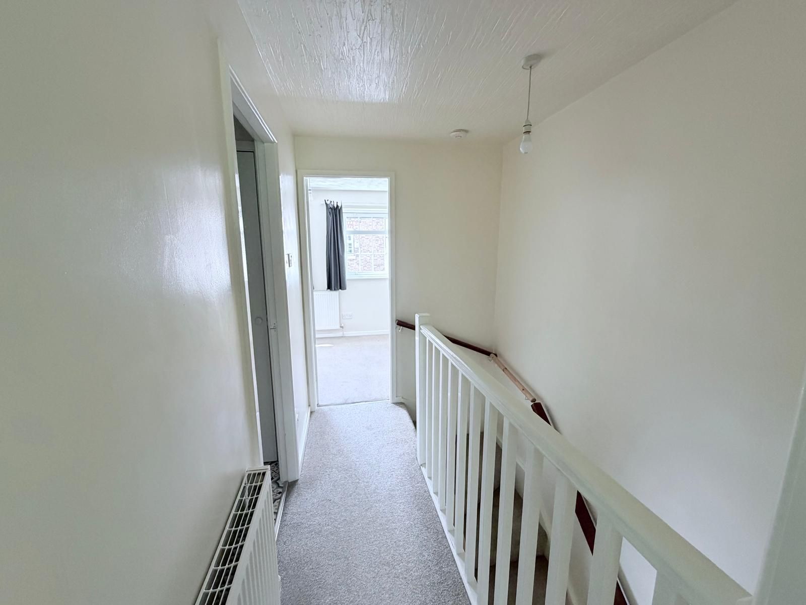 Landing ? Carpeted stairs and landing area with two handrails, a ceiling light, and a smoke detector. Hatch access to the loft.