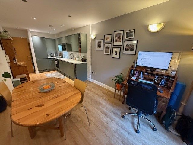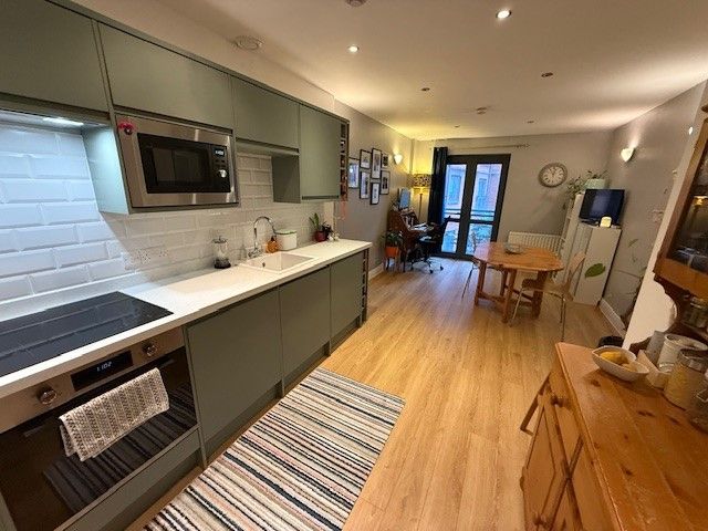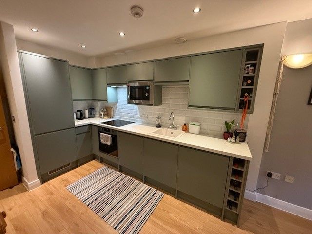 The beautifully newly fitted kitchen elevates the space, featuring a full suite of integrated appliances including a dishwasher, washer, fridge freezer, hob, and oven. Warm wooden flooring flows throughout, complemented by sleek ceiling spotlights that flood the room with natural light streaming in from the balcony. The result is a stylish, calm, and effortlessly relaxing space?perfect for unwinding or entertaining.