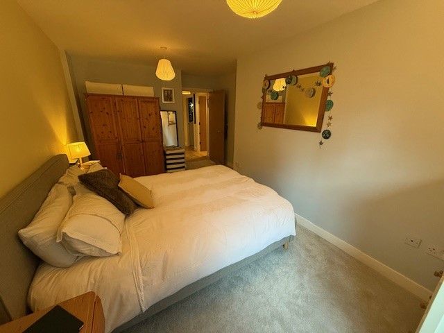 A generously proportioned second bedroom, comfortably accommodating a double bed, is currently styled as a cozy snug with a bed settee for guests. Versatile in function, it could easily serve as a stylish home office. Carpeted underfoot and filled with natural light from the UPVC window to the front, the room is further enhanced by ceiling spotlights and an electric wall heater, creating a bright and inviting space.