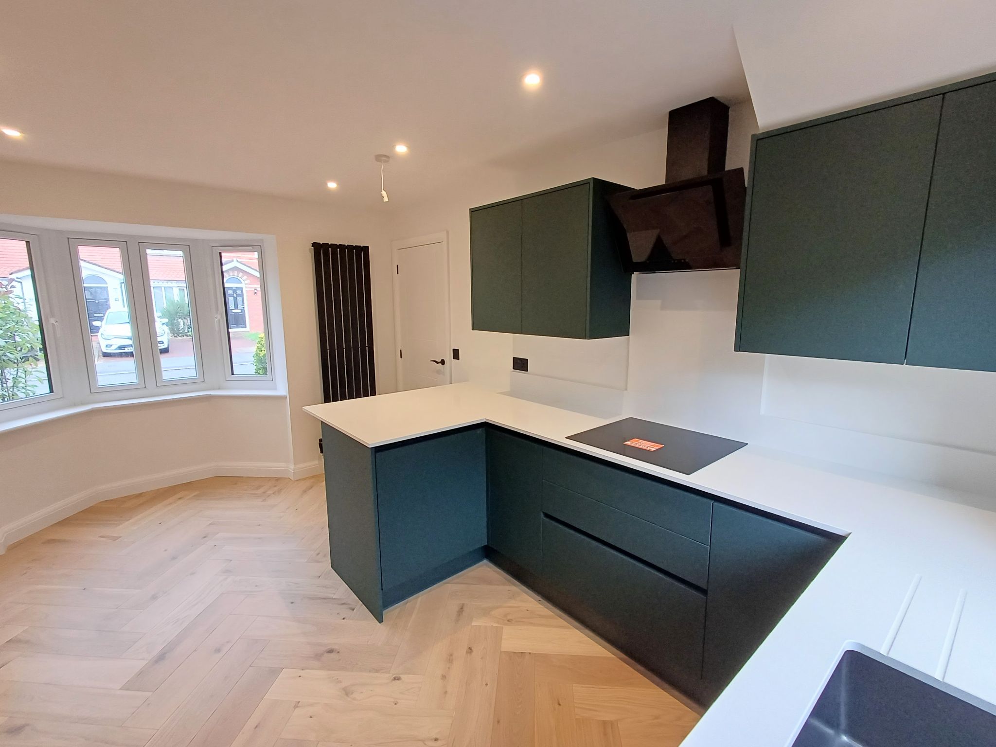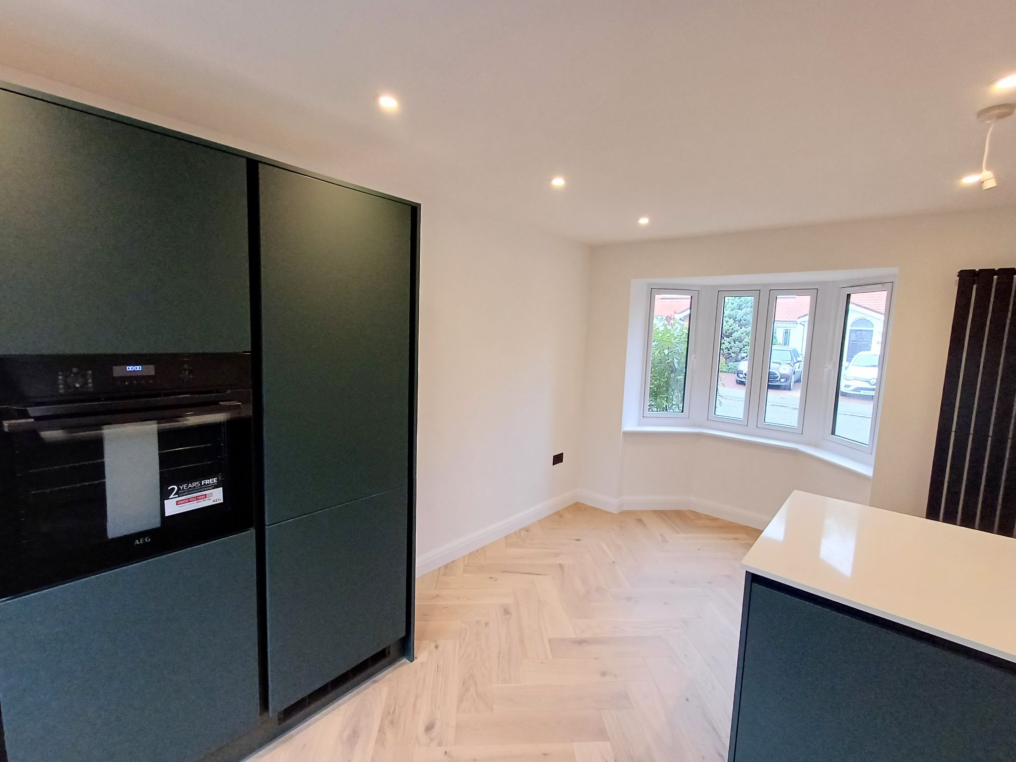Wooden door, double glazed bay window to the front elevation, double glazed window and door to the rear elevation, light wood herring bone flooring, inset spot lights, a range of wall and base units with white work surfaces over, dark chrome sink and mixer tap, integrated induction hob, oven, fridge freezer and washing machine, ladder radiator, power points.