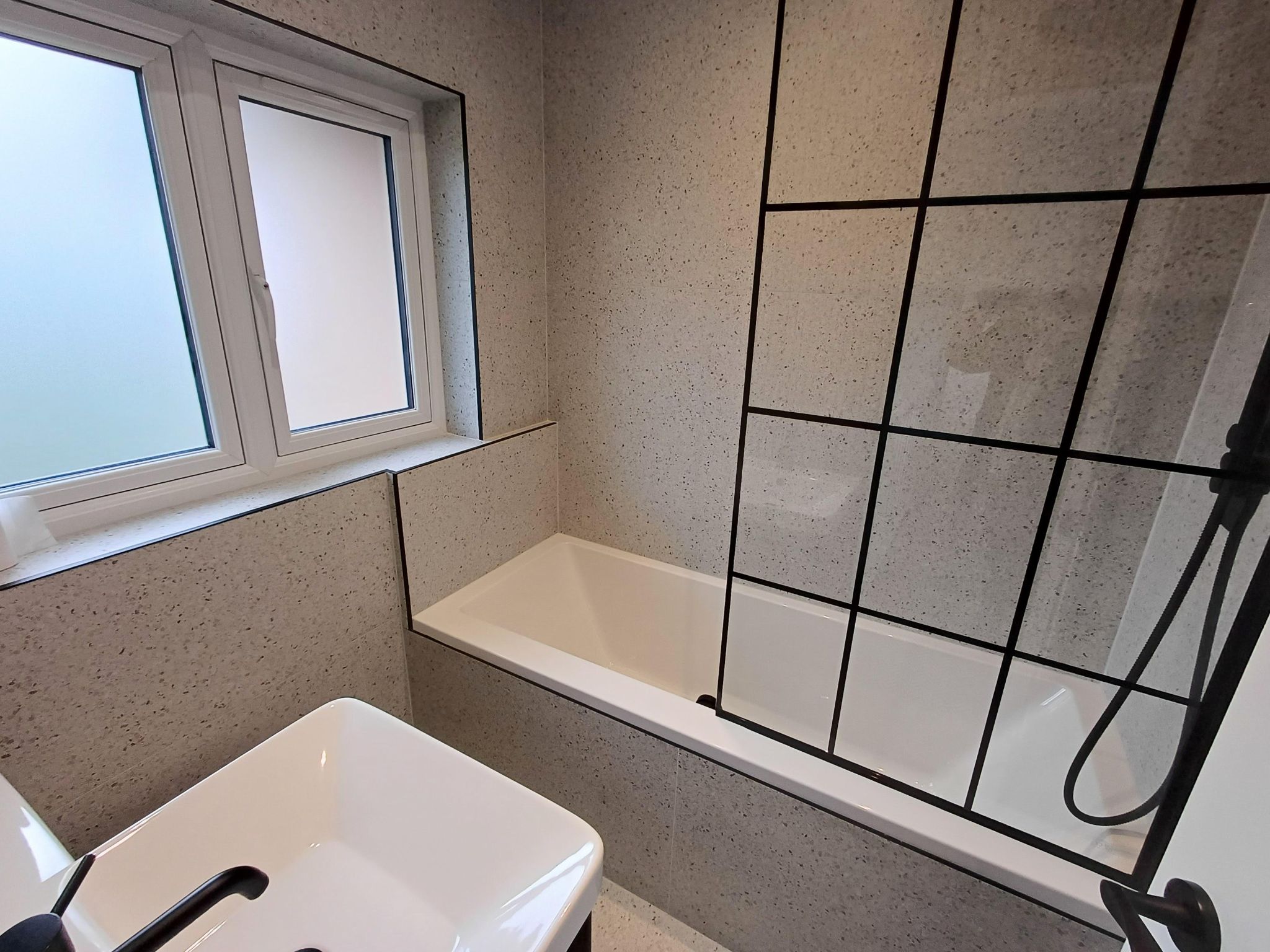 Wooden door, double glazed window to the rear elevation, inset spot lights, paneled walls and flooring, bath with shower over, pedestal wash hand basin, low level WC, ladder radiator, extractor fan.