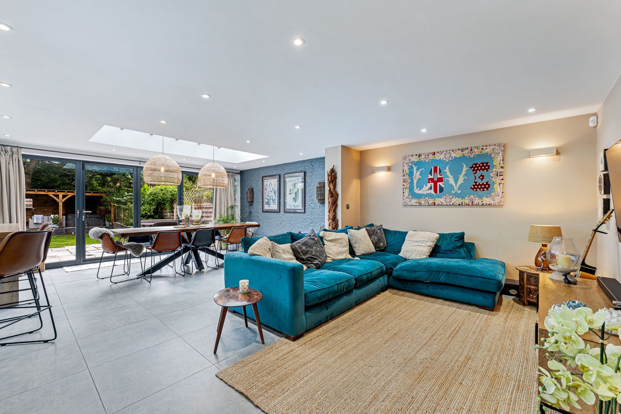 The ground floor offers an impressive layout perfect for modern family life. At the front of the property, you are welcomed into a light-filled reception hall leading to two generously proportioned reception rooms, ideal for both formal entertaining and relaxed everyday living. The sleek and contemporary kitchen is well-appointed, featuring integrated appliances and ample workspace, seamlessly connecting with the dining area, underfloor heating, which opens directly onto the rear garden through full-width Bi-Fold doors. A guest cloakroom and practical utility space complete the ground floor accommodation.